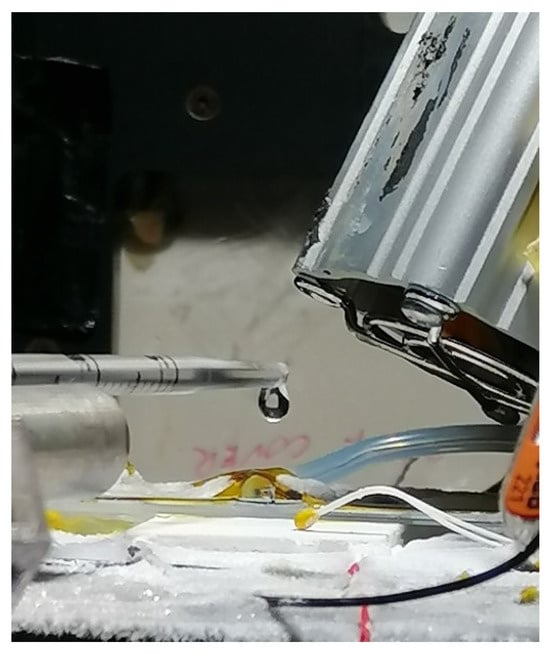 Each sample was mounted on a Tec1-12715 Peltier element measuring 40 × 40 × 3.3 mm. This element operated on the Peltier effect, generating a temperature difference between its two sides when a voltage was applied. The cold side could reach temperatures below room temperature, allowing ice formation, and T was the temperature measured on the cold side of the Peltier. A heat sink was attached to the hot side to dissipate heat rapidly.