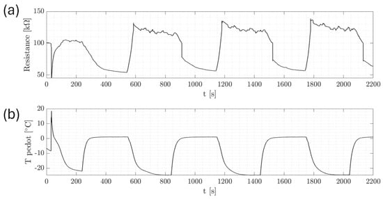 For data acquisition, the ice detector was connected to an Agilent 34970A (Agilent Technologies, Santa Clara, CA, USA) data logger, which read three temperature values (two from thermocouples on chamber walls and one from the sensing element of the detector) and the internal resistance of the sample, including the PEDOT, graphene strips, and electrical connections. This instrument combined precision measurement capabilities with flexible signal connections and was capable of logging and data acquisition. During the tests in the climate chamber, data were acquired at a frequency of 5 Hz.