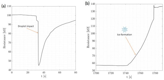 were attributed to heat exchange phenomena, while abrupt resistance fluctuations were mainly attributed to the reduced conductivity of ice compared to water, a characteristic that became evident during the phase transition [
