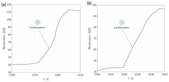 Response of the ice detection sensor at (a) ( = 15 °C and (b) = 10 °C with = −20 °C.