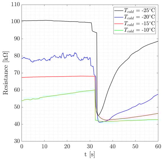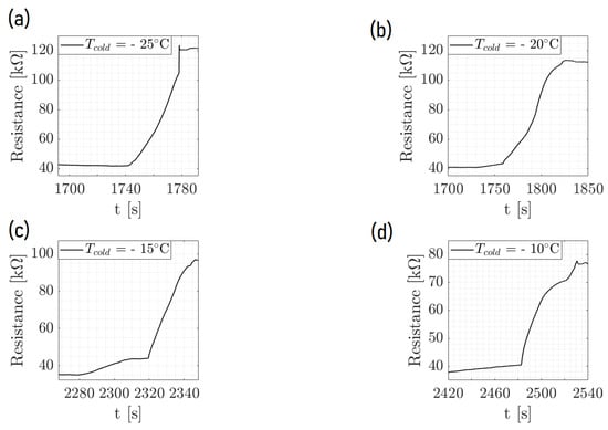 Temperature-controlled chamber experiment with T = 15 C illustrating the resistance change due to ice formation at a fixed chamber temperature of 15 °C. The subfigures (a–d) demonstrate the sensor’s response over time at various cold junction temperatures: (a) −25 °C, (b) −20 °C, (c) −15 °C, and (d) −10 °C. The sharp increase in resistance indicates the onset of ice formation on the sensor surface.