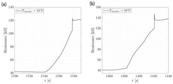 Figure 9 shows the resistance behavior of an ice detection sensor during the phase change within the environmental chamber, demonstrating the effect of the ambient temperature on the amplitude of the ice signal. As the chamber’s temperature was systematically lowered, the amplitude of the resistance signal increased, which was indicative of the enhanced sensitivity of the sensor to the phase change at colder ambient temperatures. This implies that the colder the chamber when keeping the same temperature of the droplet and plate for the cycles, the more distinct the resistance change, which is critical for precise ice detection. The comparison between the two graphs at different chamber temperatures (15 °C and 10 °C) highlights the sensor’s response to environmental changes, reinforcing the importance of temperature control in the calibration and operation of ice detection systems. This analysis confirms the sensor’s reliability and its potential application in environments where temperature variations play a crucial role in the formation of ice.