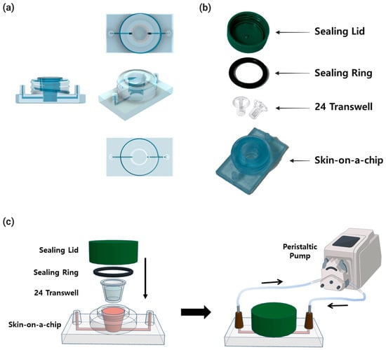 Skin-on-a-chip utilizes a design that has been widely used for 3D culture in previous studies [,]. Transwell 24-well cell culture plates (24 Transwell; SPL Life Sciences, Cat. No. 36124, Pocheon, Republic of Korea) were set up as culture wells and inserted into the chip to perform dynamic culture.