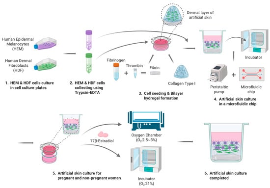 Protocol for 3D artificial skin culture on the Artificial Skin Platform for the treatment of skin pigmentation in pregnant women: 1. HDF and HEM cells culture in cell culture plates; 2. HDF and HEM cells collected using Trypsin-EDTA; 3. Cell seeding and bilayer hydrogel fabrication; 4. 3D artificial skin culture in a microfluidic chip; 5. 3D artificial skin culture for pregnant and non-pregnant women; 6. 3D artificial skin culture completed.
