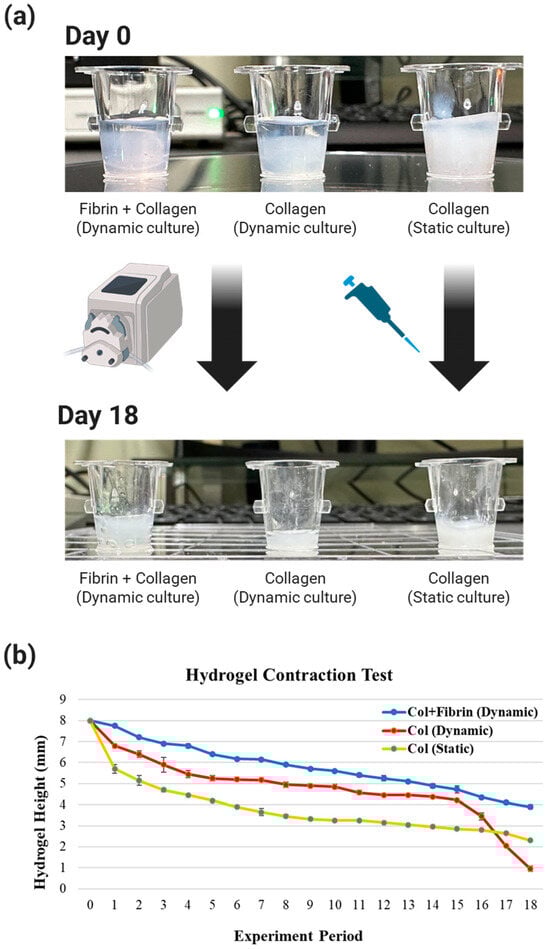 Overall, the bilayer structure of fibrin and collagen type I showed very low shrinkage compared to the other experimental groups, and the static culture of collagen type I showed higher shrinkage compared to the dynamic culture. This is due to the fact that in a static culture with a small volume of media at 37 °C, the temperature of the media quickly increases. This means that the temperature of the collagen increases, and since collagen shrinks proportionally with temperature, it is believed that the shrinkage is higher than in the dynamic culture. Since the media is continuously fed into the hydrogel, the temperature of the media is lower than that of the media in the static culture, and therefore the degree of shrinkage seems to be less. This suggests that the incubator temperature has a greater effect on hydrogel shrinkage than the tension-induced shrinkage caused by the flow rate of 1 mL/min.