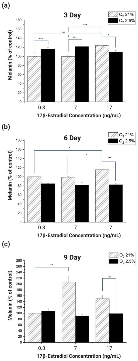 The results of the statistical analysis showed that there were no significant differences between the groups with the same E2 concentration and different oxygen concentrations, except for the group with E2 concentration of 17 ng/mL. In addition, each group had a significant trend with the group with E2 concentration of 17 ng/mL. The experimental group with 21% oxygen and 0.3 ng/mL E2 concentration had a significant increase in melanin compared to the experimental group with the same oxygen and 17 ng/mL E2 concentration (p < 0.05). There was also a significant increase in melanin between the 21% oxygen and 7 ng/mL E2 group and the same oxygen and 17 ng/mL E2 group (p < 0.05). Melanin increased significantly (p < 0.001) between the 2.5–3% oxygen and 0.3 ng/mL E2 concentration group and the same oxygen, 17 ng/mL E2 concentration group. There was a significant increase in melanin between the 2.5–3% oxygen and 7 ng/mL E2 concentrations and the same oxygen and 17 ng/mL E2 concentrations (p < 0.001).