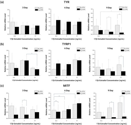 Expression of melanin-related genes was analyzed by RT-PCR at 3, 6, and 9 days after co-culture of HDF and HEM in a 2D culture environment, with oxygen and E2 concentrations adapted to the experimental conditions. Data are normalized for β-actin mRNA levels and are expressed relative to controls. Control was set as cells grown in a culture environment with an oxygen concentration of 21% and an E2 concentration of 0.3 ng/mL. (a) Expression of TYR at 3, 6, and 9 days, according to oxygen concentration and E2 concentration. (b) Expression of TYRP1 at 3, 6, and 9 days, in response to oxygen and E2 concentrations. (c) Expression of MITF at 3, 6, and 9 days, in response to oxygen and E2 concentrations. p values were calculated by ANOVA. (n = 3; *, p < 0.1; **, p < 0.05; ***, p < 0.01).