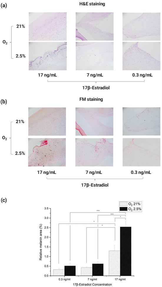 Results of H & E and Fontana Mason staining of cut sections of 3D artificial skin. (a) H & E staining results, according to oxygen concentration and E2 concentration, in artificial 3D skin culture. (b) Fontana Mason staining results, according to oxygen concentration and E2 concentration in 3D artificial skin culture. (c) The ratio of melanin pigment to the cross-sectional area of 3D artificial skin by Fontana Mason staining results. The p-value was calculated by ANOVA. (n = 3; *, p < 0.05; ***, p < 0.001).