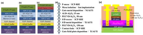 Epitaxial structure of p-GaN HEMTs: (a) normally epitaxial structure, (b) with AlN spacer, and (c) with AlN spacer & u-GaN layer. (d) Fabrication flow of p-GaN gate devices. (e) Cross-section schematic view of the p-GaN HEMT (Device C).