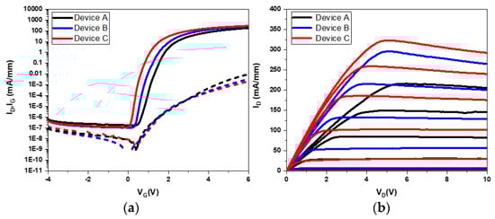 In the DC measurements of p-type GaN, HEMTs across three different structures were analyzed, revealing significant variations in gate control, drain current (ID), gate-source voltage (VG), and drain–source voltage (VD) characteristics, as illustrated in Figure 2. These devices exhibited substantial ID currents and on/off ratios, reaching up to eight orders of magnitude, highlighting the high-quality epitaxial conditions and stability of the p-GaN HEMTs fabricated. The study aimed to analyze the transfer and gate leakage characteristics of p-GaN E-mode HEMTs with varying epitaxial structures, employing a device design with dimensions LG/LGS/LGD/WG of 3/3/10/100 μm for the drain current–gate bias (ID-VG) measurement. The results, depicted in Figure 2, demonstrated linear scale transmission characteristics. VTH for devices A, B, and C were determined to be 1.5 V, 1.4 V, and 1.0 V, respectively, using a linear extrapolation method based on the maximum transconductance curve gate bias. Furthermore, the maximum drain current (ID, max) at a VG of 6 V was observed to be 198 mA/mm for Device A, 241 mA/mm for Device B, and 272 mA/mm for Device C, with maximum transconductance Gm, max values of 51.2 mS/mm, 72.7 mS/mm, and 77.3 mS/mm, respectively.