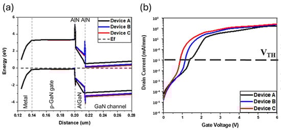 Figure 3 demonstrates that, with the inclusion of AlGaN/GaN interface traps in the analysis, the distance between the Fermi level and the bottoms of the three conduction bands widened. This phenomenon was observed across Devices A, B, and C, with all devices showing significant increases in this distance despite Device C exhibiting the smallest VTH. This observation indicated that the variations in VTH among the devices were primarily attributed to the presence of AlGaN/GaN interface traps rather than differences in the band structure. The creation of interface traps at the AlGaN/GaN interface can be explained by the discontinuities and irregularities at the material boundary, which disrupt the crystal structure and create localized energy states within the bandgap. These states can trap carriers, influencing the device’s electrical properties by affecting the Fermi level position and, consequently, the threshold voltage of the device. Interface traps introduce a complex mechanism that impacts device performance, including threshold voltage shifts, decreased mobility due to scattering, and increased leakage currents.