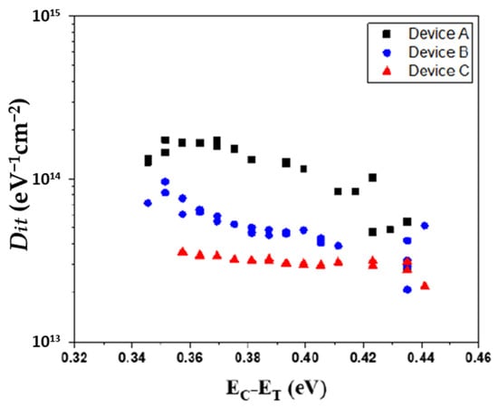 Figure 4 depicts an elaborate evaluation of the density of interface states in relation to the energy discrepancy between the conduction band edge (EC) and the trap energy level (ET), revealing that Device C exhibited a substantial decline in the density of Dit adjacent to the conduction band within shallow energy states, in stark contrast to Devices A and B. This notable decrease is indicative of a significant enhancement in the quality of the interface, a factor that is essential for the operational efficacy of the device. An assessment of Dit against the energy variation (∆E) was methodically carried out for all devices utilizing the conductance method by Equations (1) and (2). The results disclosed interface trap densities for Devices A, B, and C as 1.75 × 1014 to 2.85 × 1013 cm−2 eV−1, 6.44 × 1013 to 2.09 × 1013 cm−2 eV−1, and 3.6 × 1013 to 2.21 × 1013 cm−2 eV−1, respectively, as illustrated in Figure 4. These findings highlight the disparities in interface quality among the devices, with Device C achieving the most optimal result in terms of diminished trap density.