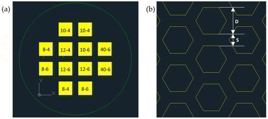Figure 2. (a) Close-packed hexagonal micropore array patterns within a 4″ wafer area. Each array is designated by the pore size D and spacing S in the format of D-S in micrometers; (b) Zoom-in view of a hexagonal micropore array.
