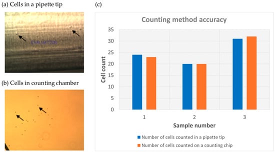 Figure 6. Low number of SJSA-1 cell counting in a 10 µL pipette tip. (a) SJSA-1 cells observed by phase-contrast microscopy in the tip; (b) same SJSA-1 cells loaded into a counting chamber slide and counted under phase-contrast microscopy; (the arrows show locations of representative cells inside the pipette tip and the counting chamber respectively.) (c) three counting results with the numbers from the pipette tip and the numbers from a counting chamber slide.