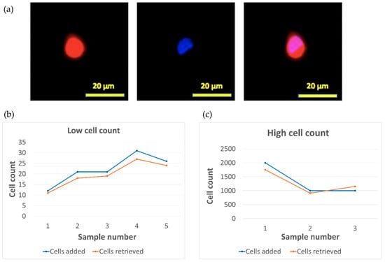Figure 7. (a) CellTracker (left), DAPI (middle), and combined (right) fluorescent images of a capture SJSA-1 cell; Spiked cell capture rates for (b) low spiked cell number and (c) high spiked cell number.