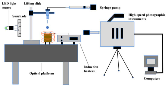 Figure 1 shows the schematic diagram of the experimental platform for the droplet impact wall. The platform consists of a hardware system composed of a generation device, an acquisition system, a surface heating system, and a bench support system. The software system is composed of image acquisition, droplet generation control, and temperature acquisition systems. During the experiment, a high-speed camera, model PHOTRON Nova S9 by Photron Limited, Tokyo, Japan, with a maximum resolution of 1024 × 1024, was arranged on the front of the impact surface. A macro lens, Nikon 85 mm f/2.8 1-5X Super Macro by Shenyang ZHONGYI Optical Technology Co., Ltd., Shenyang, China, was mounted on the high-speed camera, and the high-speed camera was connected to the computer through a network cable interface, so that the pictures obtained from the shooting could be transmitted and stored in real time.