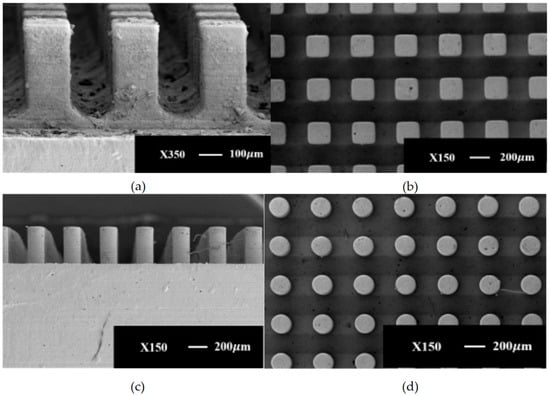 Scanning electron microscope images (SEM 3200) of different ceramic micropillar array structures using the Pμsl technique: (a,b) 200 μm × 200 μm × 450 μm rectangular microcolumn arrays; (c,d) 450 μm × 200 μm × 400 μm cylindrical microcolumn arrays.
