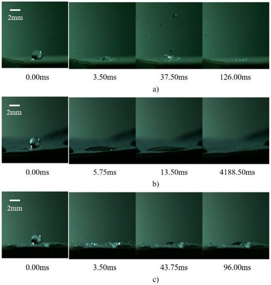 Droplet images after a single droplet impacting a rectangular array of fiber layers in different arrangements: (a) no fiber membrane; (b) fiber membrane placed on top; (c) fiber membrane placed inside.