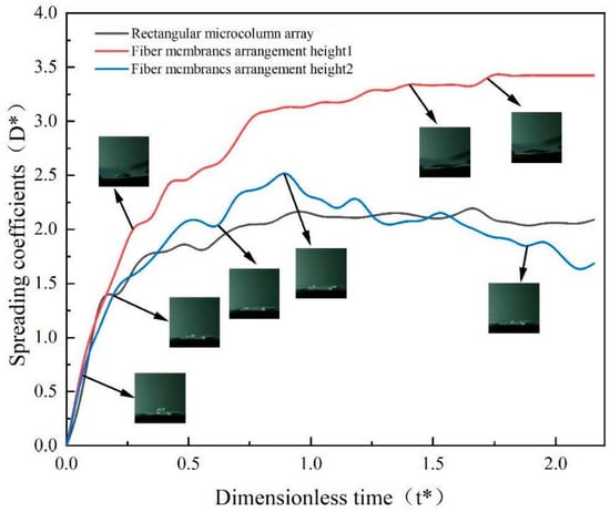 - Overall, the magnitude of the droplet spreading coefficient is mainly related to the arrangement of the fiber membrane. Since the fiber membrane will change the surface morphology of the microcolumn array, which in turn will change the droplet adhesion, the droplet spreading coefficient will also be changed. When the fiber membrane is arranged at the top of the microcolumn structure, the spreading coefficient is increased by 43% to 46% compared to no fiber membrane. When the fiber membrane is placed on the inside of the microcolumn structure, the spreading coefficient increases by 20% to 33% compared to no fiber membrane.