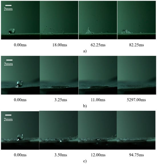 Relative uncertainty of droplet wall impact time: the total duration for the droplet to travel from the probe to the wall is recorded as = 0.228 s, and the moment of the droplet’s impact on the wall within the experiment is identified by the final image captured before impact. With the high-speed camera (PHOTRON Nova S9) configured to a frame rate of 4000 fps, the time gap between successive frames is calculated as = 1/4000 s = 0.25 ms. Then, the relative uncertainty can be expressed as follows: