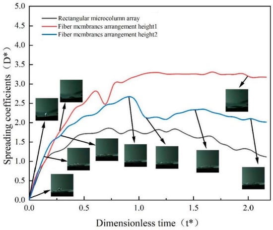 Figure 9 illustrates the variations in the spreading coefficient of droplets impacting cylindrical micropillar arrays, differentiated by the arrangement of fiber membranes. For the array without any fiber membrane, the spreading coefficient initially ascends to a peak value of 1.75, maintains stability for a brief interval, and then exhibits a gradual decline as dimensionless time progresses. In contrast, when the droplet impacts a fiber membrane positioned atop the columnar wall, the spreading coefficient progressively increases with dimensionless time, ultimately stabilizing at 3.25. Furthermore, the impact on a fiber membrane embedded within the micropillar array elevates the peak spreading coefficient to 2.6, marking a 33% increase over the maximum value observed in the absence of a membrane. Notably, the presence of a fiber membrane atop the microcolumn structure boosts the spreading coefficient to 3.6, representing a 46% increment compared to the non-membrane setup, albeit a 13% decrease relative to the configuration at a lower arrangement height.