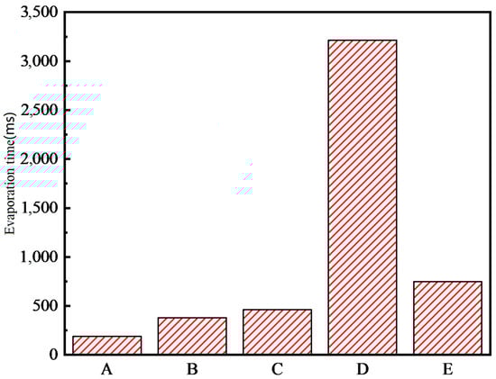 Figure 13 displays the evaporation times of droplets interacting with rectangular micropillar arrays and cylindrical arrays, each with varying fiber layer arrangements. In this figure, ‘A’ corresponds to the rectangular micropillar array 2 structure, ‘B’ corresponds to the same array with an added fiber layer, ‘C’ represents the cylindrical array structure, ‘D’ refers to the cylindrical array with a fiber layer positioned atop the micropillars, and ‘E’ depicts the cylindrical array with the fiber layer embedded within the micropillars.