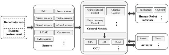 Sensors are devices that are capable of perceiving and converting environmental information into electrical signals or other required formats according to specific rules, as well as transmitting them to other devices. Robots utilize a variety of sensors to detect different aspects of their environment. Generally, sensors are divided into two main categories based on their operating principles [16]. Proprioceptive sensors are used to measure the internal values of a dynamic system (such as a robot), like motor speed, robot arm joint angles, and robot pose. This article will introduce the proprioceptive sensors used in robot control applications, including Inertial Measurement Units (IMUs), magnetometers, accelerometers, and gyroscopes. Exteroceptive sensors, in contrast, acquire information from a robot’s environment, such as, measurements of distance, light intensity, sound amplitude, temperature, force magnitude, gas concentration, and image information. Therefore, the measurements obtained from exteroceptive sensors are interpreted by the robot to extract meaningful environmental features. In robot control applications, exteroceptive sensors include tactile, force, ultrasonic, infrared, LiDAR, gas, sound, vision, and EMG sensors, which will also be discussed in this article.