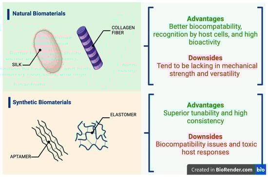 Various biomaterial examples, both natural and synthetic, which pertain to protein therapeutic delivery applications: advantages and downsides of natural biomaterials when attempting to formulate biomedical devices which utilize these for protein delivery. These materials can be fabricated into various drug delivery vehicles such as hydrogels, scaffolds, films, nanoparticles, and gels (top); advantages and downsides of synthetic biomaterials when attempting to formulate biomedical devices which utilize these for protein delivery—under research for drug delivery applications (bottom) (Created with BioRender.com).