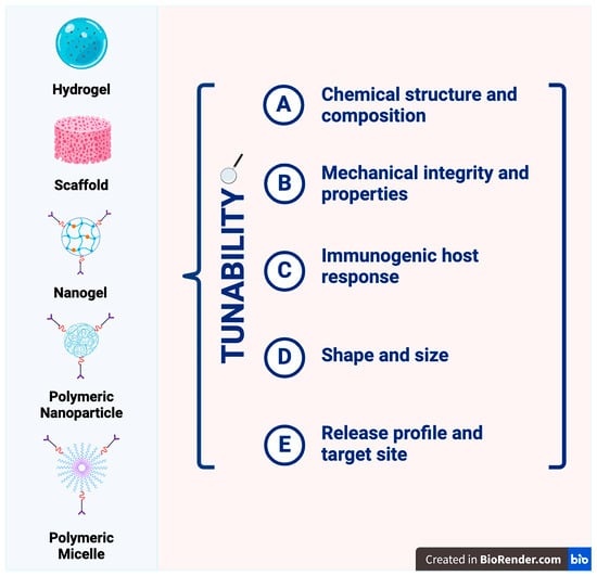 Polymeric nanoparticles include particles smaller than one micrometer in diameter that contain bioactive materials and can be loaded within or onto a polymeric core []. Polymeric nanoparticles can be classified as either a nanocapsule or a nanosphere, both of which are able to contain drug or protein compounds for targeted delivery and follow first-order and zero-order release kinetics, respectively []. Typically, polymeric nanoparticles exhibit high structural integrity and storage stability, as well as controlled release mechanisms []. These nanoparticles function very similarly to nanogels and differ only in that they are not embedded within a hydrogel matrix. Closely related to polymeric nanoparticles are liposomes, which have improved biocompatibility due to their structure closely resembling that of biological membranes, thought to function similarly to nanoparticles. Further research has delved into the combination of liposomes and polymeric nanoparticles, resulting in the development of lipid–polymer hybrid nanoparticles (LPNs) which combine the advantages of both systems while making up for the limitations of each system []. Polymeric micelles closely resemble polymeric nanoparticles and liposomes in that they have a nanoscale core surrounded by an amphiphilic block of copolymers []. They too have been widely used for drug delivery and have shown their ability to attenuate systemic toxicity, enhance targeted delivery, and improve efficacy [].