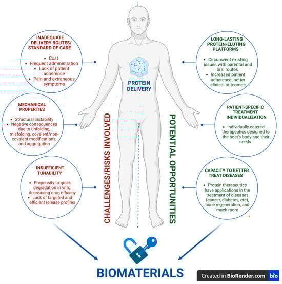 Though protein therapies are highly favored by researchers, they still face a hindering obstacle on the road toward clinical translation: efficient and targeted delivery mechanics. In nearly all cases, such therapies succeed because they both protect the protein’s structure from degradation in order to ensure the protein’s efficacy and simultaneously interact specifically with the corresponding target site in the body [,,]. Although protein-based therapeutics show a high specificity at much lower concentrations than small-molecule drugs, integrating biomaterials into these therapeutic systems can help in overcoming difficulties through efficient and targeted delivery [,]. Biomaterials would allow for effective treatment without risking a high variability in drug circulation and concentration. In many cases, the application of protein therapeutics via traditional routes results in issues such as significant non-specific tissue–organ interactions, poor stability and solubility, adverse effects, and longevity issues, which, in turn, potentially lead to drug waste and extraneous costs for both patients and clinicians (Figure 3) []. Biomaterials would assist in such problems by acting as facilitators of sustained release where the drug would require less frequent administration to minimize issues with patient adherence and allow for a greater degree of control on drug release kinetics and circulation throughout the body []. For example, utilizing elastin-like polymers (ELP) like Poly(VPAVG) for bone regeneration demonstrated great success in terms of encapsulation efficiency, biological activity, and release profile of the therapeutics [,,]. Biomaterials such as ELP could significantly assist in improving protein therapeutic delivery by allowing for the inclusion of factors such as self-assembly triggers and enzymatic degradation sequences, which, overall, further the targeting potential within platforms such as nanocarriers, aggregates, micelles, and hydrogels [].