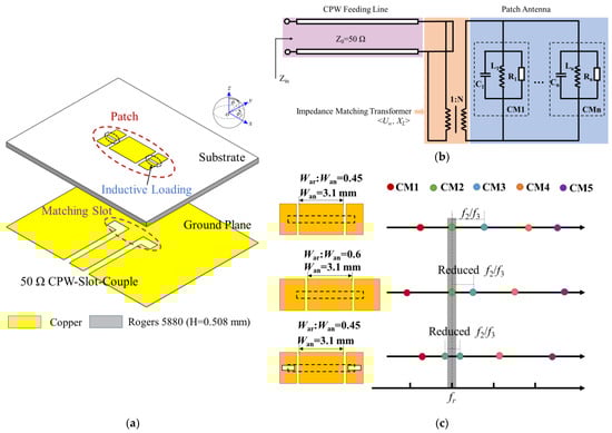 The driven antenna element characteristic mode analysis and design processes are presented in Ref. []. The antenna is composed of a nonuniform patch with a pair of coupling slots on a low-dielectric-constant high-frequency substrate (Rogers 5880, USA, ROGERS Corporation, h = 0.508 mm, εr = 2.2, tanδ = 0.0009), as shown in Figure 2a. The equivalent circuit is shown in Figure 2b, which could be characterized by a series of characteristic modes (CMn). An inductively coupled excitation (ICE), such as conductor circles or slots, could move a higher-order CM to a lower-order desired CM to enhance the bandwidth of the antenna. As shown in Figure 2c, two matching slots adopted on the patch are used for impedance matching, which can help enhance the bandwidth and gain by shifting CM3 closer to CM2.