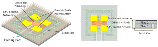 To improve the gain, the parasitic patch antenna array layer was designed based on the driven antenna element above; Figure 4 shows a schematic diagram of the multilayer antenna subarray, which ignores the bonding layer. The whole antenna subarray consists of three layers of metal plates and two layers of Rogers 5880 plates. From bottom to top, the first metal plate layer is the CSC feeding network, which also serves as the ground for the second layer of the driven antenna element; the third metal plate layer is the parasitic antenna array, and four patches form a subarray, which are couple-fed by a driven antenna element; each layer of the antenna subarray is connected by metal vias, which could reduce the mutual coupling between the driven antenna element and the parasitic antenna array, as well as suppressing surface waves []. Figure 5a shows the main view of the antenna subarray, and Table 1 gives each dimension parameter.