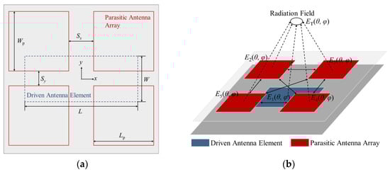As shown in Figure 5b, the radiation field of the antenna subarray (ET) can be regarded as a superposition field under the mutual coupling between the driven antenna element, Ed = E1, and the parasitic antenna array, EP = (E2||E3||E4||E5), which could be described by the mutual coupling coefficient, KC: