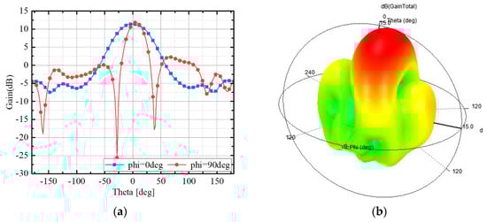 Simulation results of antenna subarray radiation pattern at 30 GHz: (a) gain; (b) directional diagram.