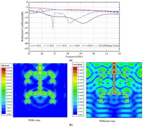 According to the calculated size of the feeding network, a 3D model is established in the electromagnetic simulation software HFSS. The simulated S-parameter curve of the feeding network is shown in Figure 8. It can be seen from the figure that in the frequency range of 26 GHz to 31 GHz, the reflection coefficient of port 1 |S11| > 10 dB, and the reflection coefficients of port 1 to 2, 3, 4, and 5 (|S12-5|) are in the range of 6–8 dB, which meets the design requirements of the 1to4 feeding network. The simulated S11 curve of the feeding network without vias is also shown in Figure 8a. It can be seen that the S11 of the feeding network without vias deteriorates rapidly at frequencies >30 GHz. As shown in Figure 8b, it can be seen from the surface current distribution diagram that at 30 GHz, the metal vias can effectively reduce the surface current distribution, reduce energy loss, and improve the isolation between each feed port.