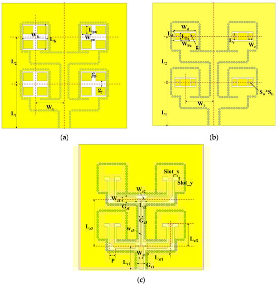 Schematic diagram of antenna layers: (a) parasitic antenna array layer; (b) driven slot patch antenna layer; (c) CSC feeding network layer.