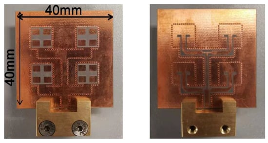 In this paper, the multilayer antenna array consists of three layers of metal plates and two layers of Rogers 5880 plates, and multiple plates are connected by bonding layers (FR28-0040-50, εr = 2.74, h = 0.1 mm). From bottom to top, the first metal plate layer is the 1to4 CSC feeding network, which also serves as the ground for the second layer of the 2 × 2 driven slot patch antenna array; the third metal plate layer is the 4 × 4 parasitic antenna array, which is couple-fed by a driven antenna element; each layer of the antenna array is connected by metal vias. The fabricated antenna array is shown in Figure 10.