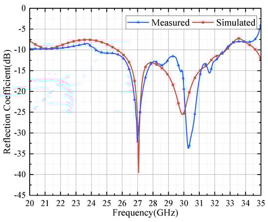 The simulated and measured reflection coefficients are shown in Figure 11. We simulated the proposed antenna through the HFSS software. There are two peaks in the reflection coefficient curve with the central frequencies of 27 GHz and 30.2 GHz, which are derived from the driven layer and parasitic layer, respectively. It can be observed that the simulated and measured results agree well with each other at low frequencies, but the measured results are greater than the simulated one in the range of 29 GHz to 30 GHz, and the resonant point near 30 GHz moves to the high-frequency band, which may be due to the influence of mutual coupling between parasitic patches in the measured field. In the frequency range of 25 GHz to 32 GHz, the reflection coefficient of the proposed antenna array |S11| < −10 dB, and the relative bandwidth is 24.5%.