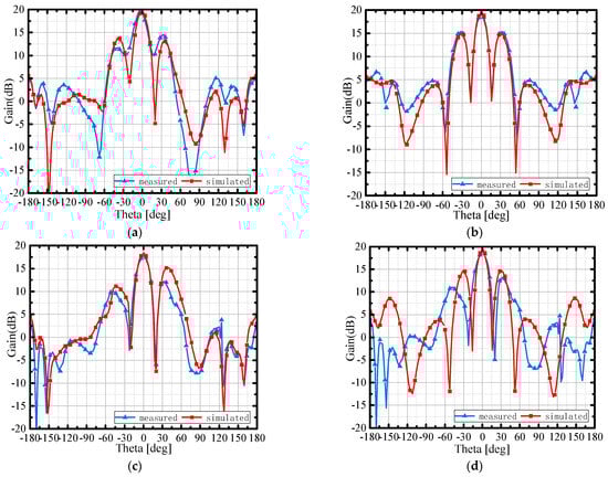 At the frequency of 27 GHz, the maximum simulation gain in the main radiation direction is 19 dB, and the measured peak gain is 19.6 dB. At the frequency of 30 GHz, the simulation result is 16 dB, and the measured peak gain is 18.8 dB. It can be observed that the results of the simulated and measured peak gains agree well in the main beam direction. However, there are strong minor lobes because the distance between the parasitic subarrays (as shown in Figure 4) is up to 1.45λ, which is greater than one λ, where λ is the wavelength of 30 GHz. The strong minor lobes can be suppressed by a more compact feeding network to reduce the antenna unit space. Generally speaking, there is a stable radiation pattern of the antenna array.