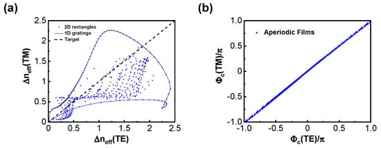 Phase modulation of the designed metasurface. (a) The coverage range of TE and TM effective index differences for pillars at different fill factors. The solid line represents the coverage range of 1D gratings, dots represent the coverage range of 2D rectangles, and the dashed line represents the target value. (b) The modulation range of the interface phase of the aperiodic films under different polarization incidences (TE and TM). is very close under different polarizations.