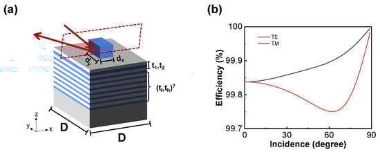 In summary, by adjusting the parameters of the upper structure and the thickness of aperiodic films, the energy of the 0th order reflection of the metasurface can be effectively suppressed. Due to the polarization insensitivity of 2D rectangular pillars, the diffraction efficiency of the −1st order can reach 100% for both TE and TM polarizations.