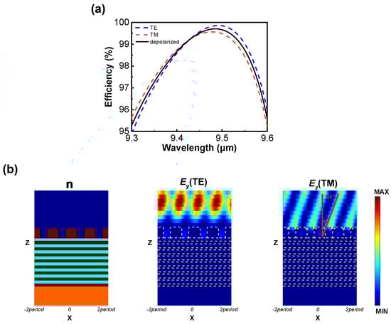Simulation results of the designed metasurface. (a) Efficiency curve of the metasurface operating from 9.3 µm to 9.6 µm. (b) Electric field distribution profile for four periods under TE incidence (Ey) and TM incidence (Ez). From left to right are the refractive index distribution plot of the structure, the y-component of the electric field under TE incidence, and the z-component of the electric field under TM incidence.