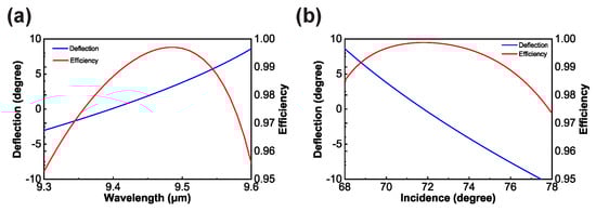 The deflection and average efficiency with (a) wavelength variation and (b) incidence variation.