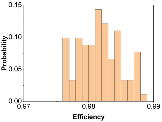 In order to validate the theoretical accuracy and the feasibility of fabrication, we employed the Monte Carlo method to calculate the tolerance of design parameters []. We randomly sampled the design parameters within a tolerance range of ±10% for 500 iterations and obtained the average polarization-independent efficiency. By statistical analysis, we obtained the probability distribution of efficiency, as shown in Figure 6. The results indicate that the designed metasurface device exhibits excellent fabrication tolerance, with over 97% high efficiency achievable within the ±10% tolerance range.