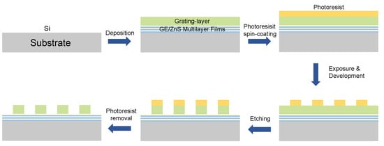 The Ge/ZnS multilayer films were initially deposited on a Si substrate through electron beam evaporation. Following the deposition of 7 sets of periodic reflection layers and 2 aperiodic layers, Ge was further deposited on top of them to serve as the grating layer. Subsequently, photoresist was spin-coated, serving as a mask. Following this, the pattern was written using electron beam lithography. After exposure, the resist was developed and fixed.