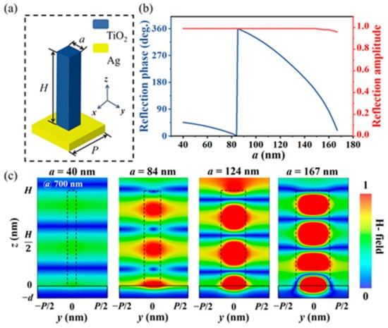 To explore the influence of metalens structure height on the focusing performance, the reflective basic unit shown in Figure 1a was designed. The typical unit is composed of a silver substrate and a titanium dioxide square column located on it. The refractive index of TiO2 is given by the dispersion equation [], and the dielectric constant of Ag is calculated by the Drude model []. The thickness of the silver substrate d = 100 nm greater than the skin depth of visible light, which can effectively prevent the penetration of the incident field and provide additional phase shifting. Therefore, the reflective metalens may be more sensitive to fabrication errors than the transmissive. The structural units were simulated using CST Studio Suite (Dassault Systèmes simulation). The incident light is assumed to be x-polarized with a wavelength of 700 nm, propagating along the z-axis, with the electric and magnetic field vectors located in the x–y plane. The boundary conditions in both the x and y directions are unit cells, and in the z-direction, the boundary condition is open, and there is a vacuum layer of a certain thickness on top of the structure. A port is provided at the top of the vacuum layer, and the reflected light is collected at the port to obtain the phase delay and transmittance of the structure. To optimize the performance of the nanostructures, we swept the side lengths from 20 nm to 300 nm in steps of 5 nm. Finally, the height of the TiO2 square nanocolumn H = 800 nm with a period P = 350 nm can achieve full-phase coverage by changing the side length a (from 40 nm to 167 nm) [,], and in this process, the reflection amplitude of the unit is close to 1 (as shown in Figure 1b), meeting the basic design requirements for a reflective metalens [,]. To reveal the phase response mechanism of the meta-unit, as shown in Figure 1c, CST Microwave Studio was used to perform near-field simulation on the basic units with different side lengths by adding magnetic field monitors and extracting their magnetic field distribution maps. Figure 1c reveals that when the designed unit structure interacts with the normal incidence light field, the magnetic field energy can be localized inside the nanobricks, and the mutual coupling between adjacent structures can be suppressed. Therefore, a single TiO2 nanobrick can be regarded as an independent truncated waveguide for transmission phase modulation [,]. As the side length of the dielectric column increases (Figure 1c), the number of transmission envelopes in the dielectric column increases gradually, which is highly consistent with the unit simulation results in Figure 1b. In addition, considering the absorption of the light field caused by the plasma resonance between the titanium dioxide nanobricks and the silver substrate (as shown in the fourth figure in Figure 1c), it is further revealed that when the side length of the structure in Figure 1b is larger, the reflection amplitude is attenuated.