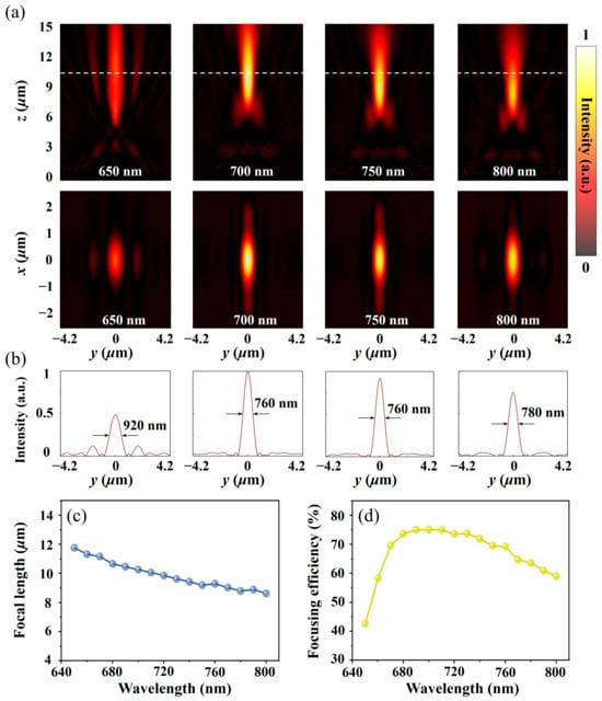 To show the focusing performance of the designed metalens, a full-wave metalens simulation was immediately carried out, and the power flow density distribution on the focal plane (y–z plane and x–y plane in Figure 3a) was extracted (in the simulation process, a plane wave was used as the excitation source, and the polarization was along the x direction). Figure 3a shows that when the wavelength of the normal incident light gradually increases from 650 nm to 800 nm, the corresponding focal length gradually decreases, which conforms to the dispersion characteristics of the light field. In addition, the second line of Figure 3a shows that the collection ability of the metalens toward the light wave increases first and then decreases and reaches the maximum at the preset wavelength of 700 nm. The attenuation of the focusing performance at short wavelengths occurs mainly because the working wavelength is equivalent to the size of the designed unit structure, which leads to the enhancement of the high-order diffraction effect and reduction in the controllable fundamental wave energy. This analysis is verified from the split focal spot at 650 nm (the leftmost graph of Figure 3b). The focusing attenuation caused by the increase in the wavelength can be attributed to the nonideal phase distribution (deviation from the ideal value designed in Formula (1)) caused by the unit phase dispersion. The focal spot size corresponding to different wavelengths is given in Figure 3b, and the focal spot size can laterally reflect the strength of the binding ability of the metalens toward space waves (the smaller the focal spot size is, the stronger the convergence ability), which is consistent with the previous analysis. Then, to further analyze the focusing characteristics of the designed metalens, the relationship between the focal length (Figure 3c), focusing efficiency (Figure 3d), and incident wavelength was obtained through numerical simulation. Focal length is defined as the distance from the energy maximum in the y–z plane to the surface of the metalens. Focusing efficiency is defined as the ratio of the reflected power flow collected by the metalens to the total incident power flow. From Figure 3d, the average focusing efficiency of the designed metalens in the wavelength range of 650 nm to 800 nm is approximately 67%, and the maximum focusing efficiency (75%) is obtained at the design wavelength of 700 nm. The overall structure shows good focusing ability. The change in focal length (Figure 3c) further illustrates that as the focal length deviates more from the design focal length, its focusing effect decreases more severely.