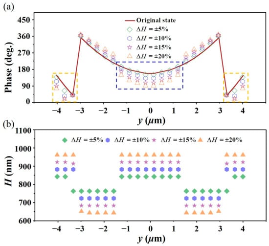 To analyze the influence of the array height variation on the focusing performance of the initially designed metalens, different height errors in composition units #1–#12 were introduced. Considering the different array height variations, the dielectric column with the maximum reflection phase difference from the ideal phase value was selected to conduct array formation and full-wave simulation again. In this process, the side length of the TiO2 nanobricks at the corresponding position remains unchanged. As shown in Figure 5a, when ΔH = ±5%, ±10%, ±15%, and ±20%, based on the aperture field phase distribution along the y direction of the metalens, the unit reflection phase offset gradually increases with the increase in the upper limit of the height variations, which is consistent with the above analysis. Table 1 shows the specific phase offset. The phase offset is the maximum value of the phase deviation of the nanobricks from the designed ideal phase at the maximum height error. Figure 5b shows the selected 12 structural unit heights, with maximum height errors of ±5%, ±10%, ±15%, and ±20%. For example, at a maximum height error of ±10% (indicated by the blue hexagon), the height of the distributed nanobricks on the y-axis corresponds to the vertical coordinate of the blue hexagon. It is evident that the maximum height variation basically corresponds to the highest degree of phase variation, which is consistent with the principle of the propagation phase.