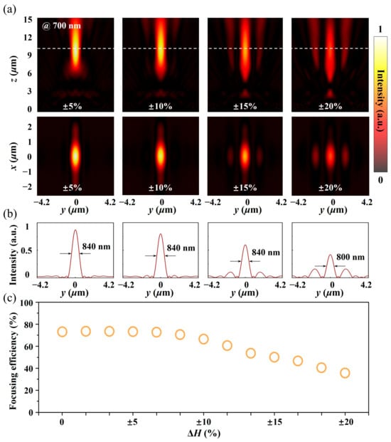 To further reveal the influence of the height variations in the TiO2 nanobricks on the focusing efficiency of the metalens and guide the processing of low-cost micro/nano-devices, the linear relationship between the height variations in the TiO2 nanobricks and the focusing efficiency was obtained by numerical calculation, as shown in Figure 6c. Figure 6c shows that the focusing efficiency of the metalens first decreases steadily and then decays rapidly with the increase in the height error. The inflection point appears at ΔH = ±8%, and the focusing efficiency attenuation is approximately 5%. This indicates that the height variation of the metalens structure is robust to the focusing efficiency of the metalens.