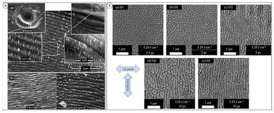The periodic structures generated on the surface are much smaller than the incident laser wavelength, and femtosecond lasers produce fewer periodic features than nanosecond and picosecond lasers, which have longer pulse durations, and are therefore more suitable for nanoraster processing. The laser energy density and the number of pulses also have an effect on the resulting nano-periodic structures. Figure 3A shows the surface morphology of a diamond sample irradiated by an 800 nm linearly polarized femtosecond laser at a laser energy density close to the diamond ablation threshold of 1.9 J/cm2 and a pulse number of 3000, where a regular 170 nm periodic nanoscale grating exists at the edges of the processed area, and a regular 170 nm periodic nanoscale grating exists at the edge of the processed area at a laser energy density of 2.8 J/cm2 and a pulse number of 8000. At a laser energy density of 2.8 J/cm2 and a pulse number of 3000, a periodic structure at the edge of the processed region is present with a regular 170 nm periodic nanoscale grating, and at a pulse number of 8000, the periodic structure at the processed region increases to 190 nm [34]. Mastellone et al. [35] used a delayed cross-polarized femtosecond laser pulse train to obtain a micro-nanostructure with two ultrahigh-frequency structural perimeters (Λ ≈ λ/10 ≈ 80 nm) on the surface of the diamond and explored the mechanism of the formation of such a structure, which is illustrated in Figure 3B.
